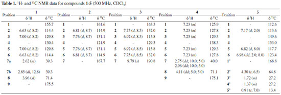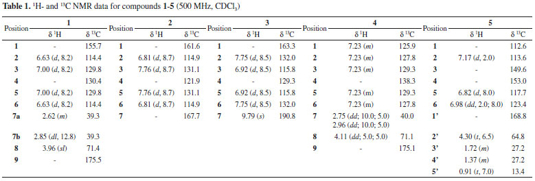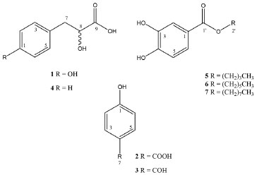 RESULTS AND DISCUSSION Through the application of the OSMAC method, the EtOAc crude extract was derived from the cultivation of Camarops sp. in Czapek's liquid medium from which seven compounds were obtained. The compounds were identified as p-hydroxyphenyllactic acid (1)7, 8, p-hydroxybenzoic acid (2)8, 9, p-hydroxybenzaldehyde (3)10, phenyllactic acid (4)11, n-butyl-3,4-dihydroxybenzoate (5)11, 12, n-hexyl-3,4-dihydroxybenzoate (6)11, 12 and n-octyl-3,4-dihydroxybenzoate (7)11, 12 (Figure 1). The NMR 1H spectra of p-hydroxyphenyllactic acid (1) (Table 1) when analyzed along with HSQC data indicated the presence of two doublets [δH 7.00 (2H, J = 8.2 Hz, H-3 and H-5, δC 129.8) and 6.63 (2H, J = 8.2 Hz, H-2 and H-6, δC 114.4)], with characteristic coupling constant for ortho-positioned hydrogen atoms, showing a disubstituted aromatic moiety. Furthermore, the presence of a methylene group [δH 2.85 (dl, J = 12.8 Hz, 1H, H-7, δC 39.3), and 2.62 (m, 1H, H-7, δC 39.3)], implying the closeness of this hydrogen to a stereogenic center, in addition to the carbon chemical shift led us to conclude that it was a benzylic carbon. An oxygenated methine group [δH 3.96 (sl, 2H, H-8, δC 71.4)] characteristic of a carbinolic hydrogen enabled the identification of a hydroxyl group directly bonded to carbon β of an aromatic ring. The HMBC correlations between H-2↔C-1/C-3/C-4, H-3↔C-2/C-5, H-5↔C-2/C-3, H-6↔C-1/C-3/C-4 and H-7↔C-4, confirmed the presence of carbonyl carbon and aromatic unit. The side chain was positioned at C-4 based on the values of chemical shifts and multiplicities of the signals of the aromatic ring signals (Table 1), leading to the identification of compound 1 as p-hydroxyphenyllactic acid.7, 8