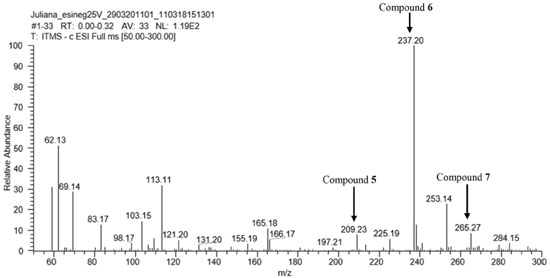 The 1H NMR spectra of p-hydroxybenzoic acid (2) (Table 1) when analyzed jointly with the HSQC data indicated seven carbons besides the presence of two doublets [δH 7.76 (2H, J = 8.7 Hz, H-3 and H-5, δC 131.1) and 6.81 (2H, J = 8.7 Hz, H-2 and H-6, δC 114.9)], bearing a characteristic coupling constant of a para hydrogen, depicting a disubstituted aromatic ring system. The analysis of HMBC showed correlations of H-2 and H-6↔C-1/C-3 and H-3 and H-5↔C-2/C-3/C-7 confirming structure 2 of p-hydroxybenzoic acid.8, 9 p-hydroxybenzaldehyde (3) was obtained in the mixture with 4. The 1H spectra of 3 (Table 1) when analyzed together with the HSQC data pointed out a similarity to compound 2, the difference observed being the presence of one singlet at δH 9.79 (H-7), suggesting the existence of an aldehyde function. These data associated with the NMR of compound 2 and the carbon δC 190.8 (C-7) in the HMBC data showed the reduction of C-7 carboxylic acid to an aldehyde function, confirming the structure 3 of p- hydroxybenzaldehyde.10 Phenyllactic acid (4) was obtained in a mixture with compound 3. 1H spectra of 4 (Table 1) when analyzed along with the HSQC data indicated a similarity with to compound 1, the difference observed being the aromatic ring which showed a monosubstituted ring. 1H NMR spectra indicated the presence of five sp2 methine groups at a complex aromatic region in a multiplet form [δH 7.23 (m, H-1, H-2, H-3, H-5, H-6)]. Compound 4 was thus identified as phenyllactic acid.11 The 1H spectra of n-butyl-3,4-dihydroxybenzoate (5) (Table 1) when analyzed along with the HSQC data indicated the presence of three sp2 methine groups, showing a trisubstituted aromatic ring system [δH 6.82 (d, J = 8.0 Hz, 1H, δC 117.7, H-5), 6.98 (dd, J = 8.0 and 2.0 Hz, 1H, δC 123.4, H-6), and 7.17 (d, J = 2.0 Hz, 1H, δC 113.6, H-2)], three methylene group found to be oxygenated [δH 4.30 (t, J = 6.5 Hz, 2H, δC 64.8, H-2'), 1.72 (m, δC 27.2, H-3') and 1.37 (m, δC 27.2, H-4')] and one methyl group [δH 0.91 (t, J = 7.0 Hz, 3H, δC 13.4, H-5')]. The HSQC correlations together with the HMBC correlations exhibited four quaternary carbons [δC 112.6 (C-1); 149.6 (C-3); 153.0 (C-4) and 168.8 (C-1')]. These data associated with the 1H-1H COSY correlations led to a trisubstituted aromatic ring with two hydroxyl groups (C-3 and C-4) and one conjugated carbonyl ester (C-1'), confirming structure 5 of n-butyl-3,4-dihydroxybenzoate. Oddly enough, though all the data as can be seen from our discussion above led us towards the proposed structure, the integration of -CH2 to the alkyl chain failed to be consistent with it. By so doing, a mass spectrum was obtained and thanks to that it was possible to detect the isomers 5-7, justifying the congruence of the 1H NMR data recorded. The structures of the esters 5-7 were confirmed by mass spectrometry (ESI-MS) which showed the presence of [M-H]- ion peaks at m/z 209.23 (n-butyl-3,4-dihydroxybenzoate); 237.19 (n-hexyl-3,4-dihydroxybenzoate) and 265.27 (n-octyl-3,4-dihydroxybenzoate) (Figure 2).11, 12