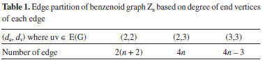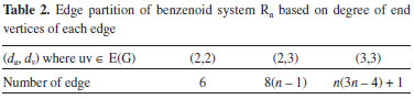 Let H be the graph of zigzag benzenoid system Zn. The edge set is partitioned into three sets, based on the degree of end vertices of each edge. The edges whose endpoints have degree (2,2) appear only on the four courners of the rhomb, which are clearly 6, whereas the edges with endpoint degree (2,3) appear in pairs along the boundary of H except the corners where they are single. Along each boundary we have 2(n - 2) + 2 edges, and summing this for four boundary lines we get total 8(n - 1) edges, and all remaining inner edges are of type (3,3). These are summarized in Table 2 below.