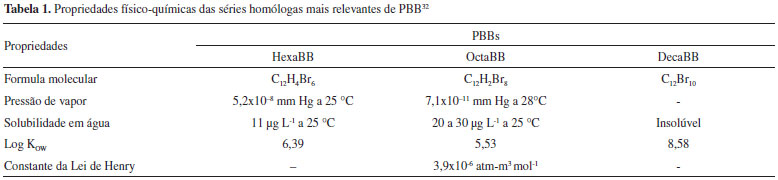 Os PBBs fazem parte de uma classe de compostos que podem ter de um a dez átomos de hidrogênio substituídos por bromo. Dessa forma, apresentam estrutura semelhante às bifenilas policloradas (PCBs) com uma nomeclatura análoga e um mesmo número de congêneres.25 Sua produçao comercial, entretanto, envolve um número restrito de compostos onde apenas 42 congêneres de PBBs foram sintetizados em laboratório.26 Eles foram disponibilizados na forma de três misturas comerciais (NTP 2011): a) Hexabromobifenil (HxBB) - formado por 4,0% de pentabromobifenis, 62,6% de hexabromobifenis e 33,4% de heptabromobifenis. Foi a principal mistura produzida representando até 87% da produçao de PBBs, sendo desses 98% produzidos na forma do produto comercial conhecido como FireMaster BP 6; b) Octabromobifenil (OBB) - sua composiçao possui 1,8% de heptabromobifenis, 47,3% de nonabromobifenil, 45,2% de octabromibifenis e 5,7% de decabromobifenil; c) Decabromobifenil (DBB) - mistura de 96,8% de decabromobifenil, 2,9% de nonabromobifenil e 0,3% octabromobifenil.21 Esses compostos, principalmente as misturas HxBB e o OBB, foram produzidos nos Estados Unidos pela Michigan Chemical Corporation; na Gra-bretanha duas empresas foram responsáveis pela produçao do DBB; na Alemanha fabricou-se o Bromkal 80-9D (basicamente nonabromobifenil); na França a empresa Atochem comercializou o DBB.27 Por terem estrutura semelhante, apresentam propriedades físico-químicas similares às bifenilas policloradas (PCBs) (Tabela 1), sendo também tóxicas, resistentes à degradaçao, hidrofóbicos, lipofílicos e, portanto, bioacumulativos.28 Devido a estas características, a mistura comercial hexabromobifenil foi incluída na lista dos POPs em maio de 2009.9 Apesar da semelhança com os PCBs, a ocorrência dos PBBs no ambiente é mais limitada devido a sua baixa produçao e menor tendência de liberaçao a partir dos termoplásticos nos quais foram incorporados.29 Os PBBs ganharam bastante atençao após um acidente em Michigan (EUA), entre 1973 e 1974, quando cerca de 250-500 quilos de FireMaster BP-6 (HxBB) foram acidentalmente adicionados à raçao animal, sendo a populaçao local posteriormente exposta através da ingestao de leites e outros alimentos contaminados.20,30 Como consequência do acidente, a empresa parou de produzir FireMaster BP-6 em 1974 e demais PBBs em 1977.20,31