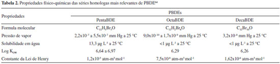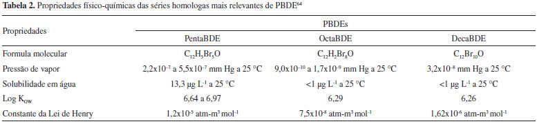 Comercialmente os PBDEs foram produzidos principalmente na forma de três misturas técnicas: Penta-BDE, Octa-BDE e Deca-BDE.56 A mistura penta-BDEs, composta principalmente por 24-37% de tetra-BDEs, 50-60% de penta-BDE, 4-8% de hexa-BDEs, foi empregada principalmente na manufatura de espumas flexíveis de poliuretano, utilizadas na confecçao de cadeiras, poltronas, sofás, colchoes, cortinas, entre outros.56,57 A mistura octa-BDE, composta principalmente por 10-12% de hexa-BDEs, 44% de hepta-BDEs, 31-35% de octa-BDEs, 10-11% de nona-BDEs e <1% de deca-BDE foi aplicada na manufatura de polímeros à base de acrilonitrila-butadieno-estireno (ABS), usado em monitores de computador e em outros aparelhos eletrônicos correlatos.57,58 Por fim, a mistura deca-BDE, composta por >97% de BDE 209 e o restante por nona-BDEs e resíduos de octa-BDEs, é empregada em têxteis e em plásticos de alta densidade usados em televisoes, computadores e outros equipamentos eletrônicos.57,59 Devido as suas propriedades (Tabela 2), os PBDEs sao resistentes à degradaçao físico-química e biológica e, consequentemente, apresentam alta persistência no ambiente. Sao lipofílicos e hidrofóbicos, podendo entao bioacumular e biomagnificar ao longo da cadeia trófica. Apresentam toxicidade aos organismos e, devido a sua baixa pressao de vapor, podem ser transportados a longas distâncias.58,60 Essas características levaram os congêneres tetra- e penta-BDE, pertencentes à mistura técnica penta-BDE, e os congêneres hexa- e hepta-BDE componentes da mistura técnica octa-BDE, a serem incluídos na lista dos Poluentes Orgânicos Persistentes (POPs) da Convençao de Estocolmo em maio de 2009.9 Alguns congêneres de PBDEs, das misturas penta e octa-BDEs já haviam tido sua produçao e comercializaçao proibida em alguns países.61 A Uniao Europeia baniu as formulaçoes comerciais penta- e octa-PBDE em 2003, porém a mistura deca-BDE continuou em uso.57 Nos EUA, as empresas decidiram voluntariamente parar a produçao da formulaçao deca-BDE no final de 2013.62 Em outubro de 2013, a Noruega propôs à Convençao de Estocolmo que a formulaçao comercial deca-BDE também fosse incluída no Anexo A da Convençao de Estocolmo.63