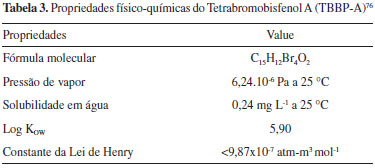 TETRABROMOBISFENOL A (TBBP-A) O tetrabromobisfenol A (TBBP-A) (Figura 3) é produzido pela bromaçao do bisfenol A (BPA) e é amplamente usado como retardante de chama em polímeros, tais como acrilonitrila-butadieno-estireno (ABS), resinas, adesivos, equipamentos elétricos e eletrônicos, eletrodomésticos, móveis e material de construçao.76,77 Sua principal aplicaçao é em resina epóxi utilizada para produçao de placas de circuito impresso, nas quais o teor de bromo pode chegar a 20% do peso.78 O TBBP-A também pode ser usado como composto base para a produçao de outros retardantes de chama comerciais, tais como tetrabromobisfenol A bis (2-hidroxietil éter), Tetrabromobisfenol A dibromopropileter, Tetrabromobisfenol A bis (alquil éter), Tetrabromobisfenol A oligômero de carbonato.76 Em funçao das suas propriedades físico-químicas (Tabela 3), o TBBP-A é considerado um composto lipofílico com grande afinidade por partículas, alta volatilidade e baixa solubilidade em água.
