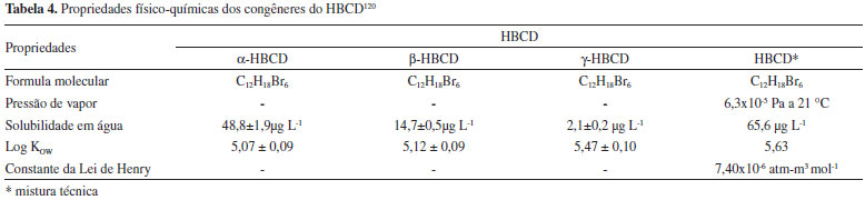 O HBCD é produzido a partir da bromaçao dos quatro isômeros do 1,5,9 ciclododecatrieno (CDTs) (trans,trans,trans-, trans,trans,cis-, trans,cis,cis-, e cis,cis,cis-CDT). Dependendo da constituiçao isomérica da mistura técnica de CDTs usada e das condiçoes do processo industrial, misturas de HBCDs com diferentes composiçoes e proporçoes entre isômeros sao produzidas. De uma forma geral, 16 estereoisômeros de HBCDs sao possíveis: seis diastoisômeros com seus pares de enantiômeros e quatro meso formas.101 Entre esses os mais comuns sao os diasteroisômeros α-, β-, γ-HBCD nas formas de enântionmero (+) e enantiômero (-).102 Na mistura técnica esses isômeros estao presentes nas seguintes proporçoes: 1- 12% para o α-HBCD, 10 - 13% para o β-HBCD e 75 - 89% para o γ-HBCD (Tabela 4).101,103