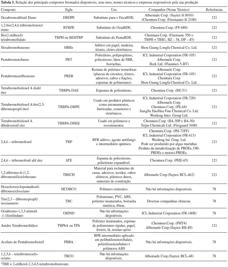 OUTROS RETARDANTES DE CHAMA BROMADOS Com as restriçoes e/ou proibiçoes no uso, produçao e comercializaçao de alguns retardantes de chamas bromados, outros compostos bromados começaram a ganhar espaço como retardantes de chama. Uma relaçao dos principais produtos atualmente disponíveis, juntamente com algumas informaçoes de uso e produçao, encontra-se na Tabela 5.