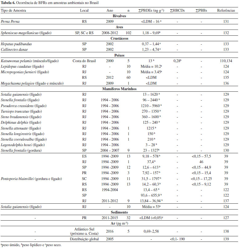 BFRs NO BRASIL: OCORRENCIA E TENDENCIAS Poucos sao os trabalhos que avaliaram a ocorrência de BFRs em amostras ambientais no Brasil. Um compilado do que se encontra publicado é apresentado na Tabela 6. Como pode ser observado, quase a totalidade dos estudos é relacionada à ocorrência de PBDEs em mamíferos marinhos, com poucos estudos realizados em amostras de peixes, sedimento, tecido adiposo humano e bivalves.39,72,122-128 Além disso, os poucos estudos realizados foram com amostras oriundas apenas das regioes sul e sudeste do Brasil. A maioria dos níveis de PBDEs detectados em amostras do Brasil é baixa. No entanto, alguns estudos reportaram valores similares aos encontrados em animais de regioes sabidamente contaminadas do Hemisfério Norte, como por exemplo os valores encontrados em golfinhos do litoral do Rio de Janeiro e Sao Paulo.129,130