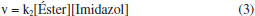 Os perfis cinéticos obtidos utilizando o colorímetro artesanal para as reaçoes propostas com diferentes concentraçoes de imidazol estao apresentados na Figura 6A, 6C e 6E, na forma linear (Eq. 8). Observa-se que todas a reaçoes seguiram um perfil de primeira ordem com relaçao ao produto fenolato (consequentemente também para o reagente acetato). O efeito da concentraçao do imidazol pode ser observado na Figura 6B, 6D e 6F através de um perfil linear que está de acordo com a equaçao 5, evidenciado que a reaçao é de primeira ordem em relaçao ao imidazol. Apesar do imidazol estar em excesso, aumentar a concentraçao dele, aumenta kobs, tornando a reaçao mais rápida. Através dos perfis da Figura 6B, 6D e 6F foram obtidos as constantes de segunda ordem (k2) pelo coeficiente angular, que é a forma mais comum de representar constantes de velocidade nucleofílicas, pois pondera o efeito da concentraçao do nucleófilo (reagente em excesso).