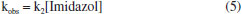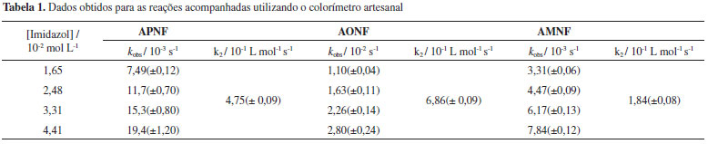 Vale ressaltar que, para as diferentes concentraçoes de imidazol, os valores de pH sao iguais a 9,9±0,1. Assim, é válido afirmar que, nas condiçoes reacionais propostas, o imidazol está na forma neutra mais reativa (vide supra) e ainda, que a reaçao nucleofílica catalisada é a reaçao que está sendo monitorada. Isso porque dado a baixa concentraçao de íons hidroxila (~10-4 mol L-1) aliada às pequenas constantes das reaçoes espontânea e alcalina (e.g. para APNF k0 = 1,1x10-5 s-1 e kOH = 1,0x10-4 mol-1 L s-1, respectivamente),22 assume-se que essas reaçoes nao contribuem significativamente para reaçao global nas condiçoes reacionais. Isso é, o tempo de meia vida das reaçoes com água (pH 7) e hidróxido (pH 10) sao 17,5 h e 26,7 meses, respectivamente, confirmando a pequena contribuiçao dessas reaçoes. Todos os resultados obtidos estao apresentados na Tabela 1.