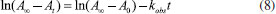 As reaçoes foram estudadas sob condiçoes de pseudo-primeira ordem, pois as concentraçoes de imidazol foram muito maiores que as do éster. Assim, a lei de velocidade de segunda ordem (equaçao 3) se reduz a uma lei de primeira ordem (equaçao 4), em que v = velocidade, k2 = constante de velocidade de segunda ordem, [Éster] = concentraçao dos éster, [Imidazol] = concentraçao de imidazol e kobs = constante de velocidade observada de primeira ordem. ![]() ![]() ![]() ![]() ![]() ![]() O estudo cinético proposto descreve o acompanhamento dos produtos fenolatos das reaçoes do Esquema 3, sendo que a lei integrada para formaçao de produto para reaçao de primeira ordem é descrita pela equaçao 6, onde [P]t = concentraçao do produto em determinado tempo, [P]∞ = concentraçao do produto no infinito, kobs = constante de velocidade observada de primeira ordem e t = tempo. Para correlacionar a concentraçao de produto com a absorbância, combina-se a equaçao 6 com a lei de Lambert-Beer, levando à equaçao 7, em que A ∞ = absorbância no infinito e At = absorbância em determinado tempo. Essa equaçao descreve os perfis de absorbância vs tempo, tipicamente obtidos, apresentados na Figura 5. A equaçao 8 é a equaçao linearizada da equaçao 7, ou seja, ao plotar valores de ln(A ∞ - At) e t no eixo y e x, respectivamente, obtém-se um perfil linear que confirma o comportamento de primeira ordem e o coeficiente angular fornece kobs. Para validar o uso do colorímetro artesanal para o acompanhamento cinético, tem-se, na Figura 5, o perfil cinético obtido utilizando o colorímetro artesanal e um equipamento comercial (espectrofotômetro UV-Vis) para reaçao do AONF com imidazol (0,015 mol L-1). Os valores de kobs obtidos para os perfis apresentados na Figura 5 foram similares (obtidos por ajuste nao-linear, Eq. 7), evidenciando que o colorímetro artesanal pode substituir com segurança o espectrofotômetro comercial no acompanhamento cinético das reaçoes.