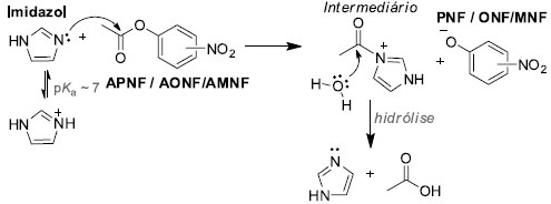 ![]() Esquema 2. Mecanismo para a reaçao dos ésteres de nitrofenila catalisado por imidazol