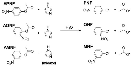 O experimento aqui proposto busca avaliar a reatividade dos acetatos de p-nitrofenila (APNF), o-nitrofenila (AONF) e m-nitrofenila (AMNF) nas reaçoes de catálise nucleofílica mediadas por imidazol. O imidazol é conhecido por ser um catalisador nucleofílico nas reaçoes com os ésteres de nitrofenila, sendo reativo apenas em sua forma neutra, onde o imidazol ataca o carbono da carbonila formando um intermediário acilado, seguido da sua hidrólise e regeneraçao do imidazol (Esquema 2).5,6 O intermediário tetraédrico apontado no Esquema 1 previsto pelo mecanismo associativo foi desconsiderado no Esquema 2, visto sua difícil detecçao. De fato, para a reaçao do imidazol com o APNF, é conhecido que a reaçao ocorre por um mecanismo de adiçao-eliminaçao (associativo) com a formaçao do intermediário tetraédrico seguido do intermediário acilado. Todavia, o intermediário tetraédrico é instável e rapidamente hidrolisado, nao sendo possível observar sua existência pelos estudos cinéticos. Já o intermediário acilado já foi observado por UV-vis sendo possível acompanhar sua cinética de formaçao e decomposiçao.6,7