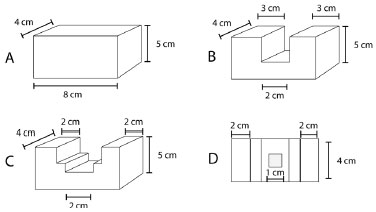 ![]() Figura 1. Montagem do suporte do colorímetro. A = Bloco retangular inicial, B = Corte central, C = Segundo corte central para acomodaçao dos LEDs e D = Vista de cima do suporte e corte quadrado para a acomodaçao da cubeta