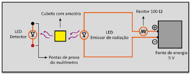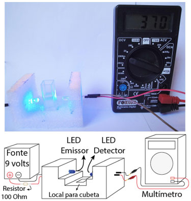 Para a montagem da fonte de radiaçao sao necessários 1 LED azul, dois fios para protoboard com entradas fêmeas, uma fonte de energia (5 v ~ 9 v) e um resistor (100 Ω). O LED apresenta uma "perna" mais comprida que a outra, referente ao polo positivo. Os fios, o resistor e o LED podem ser obtidos em lojas especializadas ou em lixo eletrônico, barateando ainda mais a montagem. A fonte de energia utilizada foi um carregador de celular, porém carregadores de outros equipamentos como telefones sem-fio, balanças, impressoras ou baterias comuns podem ser utilizados. Com o suporte montado, o LED foi encaixado. Nas pernas do LED os fios foram conectados, onde no fio ligado ao polo positivo o resistor foi preso e por fim conectados à fonte de energia de acordo com a Figura 2. Para a montagem do detector foi utilizado outro LED azul, dois fios para protoboard com entradas fêmeas e um multímetro com pontas de prova na forma de "jacarés". O LED detector foi posicionado alinhadamente ao LED emissor, os fios conectados às pernas do LED e suas respectivas pontas foram conectadas às pontas de prova do multímetro. A Figura 2 apresenta uma foto do sistema construído e a disposiçao dos componentes.