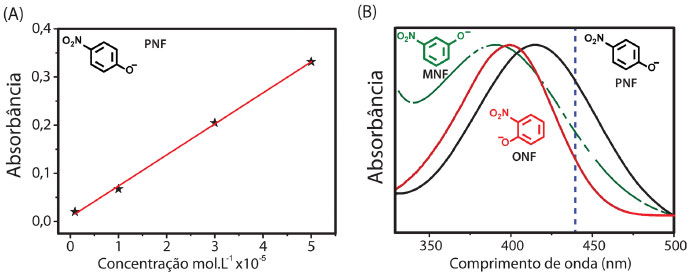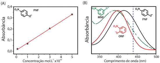 O detector do colorímetro é constituído por um LED, sendo que o multímetro faz o papel de interface entre o equipamento e a geraçao dos dados. Os LEDs, quando submetidos a uma tensao, geram radiaçao e, por outro lado, quando a radiaçao incide sobre eles ocorre o inverso, a radiaçao é transformada em tensao, podendo ser medida com o auxílio de um multímetro. Dessa forma, quando colocamos uma substância que absorve no comprimento de onda do LED emissor, parte da radiaçao é absorvida e a quantidade de luz que passa pela cubeta decai, diminuindo a tensao no LED detector. Assim, podemos relacionar a quantidade de luz que sai do LED emissor com a ddp gerada no LED detector. Podemos ainda relacionar a ddp medida com absorbância pela Equaçao 1 e 2, onde I = radiaçao transmitida, I0 = radiaçao da fonte, ddp(a) = ddp da amostra, ddp0% = ddp medida com 0% de transmitância, ddp100% = ddp medida com 100% de transmitância, A=absorbância, ε = absortividade molar, c = concentraçao e l = caminho ótico (em geral 1 cm).15 Assim, podemos obter perfis cinéticos clássicos de absorbância vs tempo através de medidas de ddp em funçao do tempo. ![]() ![]() Para evidenciar o perfil linear de absorbância vs concentraçao previstos pela Lei de Lambert-Beer (eq. 2) usando o colorímetro artesanal, como observado em espectrofotômetros usuais, foi construída uma curva de calibraçao para PNF. A Figura 4 mostra os espectros UV-Vis do PNF, ONF e MNF em meio básico (pH 10) obtidos utilizando um espectrofotômetro comercial (Perkin Elmer lambda 650), na qual a linha tracejada representa a emissao do LED azul. A Figura 4A apresenta a curva de calibraçao obtida com PNF utilizando o colorímetro artesanal, corroborando o comportamento esperado, com um bom coeficiente de correlaçao (r² = 0,99) e mostrando que o colorímetro tem resposta linear na faixa de concentraçao estudada. O valor de absortividade molar obtido pelo coeficiente angular dessa reta 6447,54 L mol-1 cm-1 (± 144,47) é menor que os valores apresentados na literatura (18380 L mol-1 cm-1),21 e já era esperado, uma vez que a radiaçao emitida pelo LED difere do comprimento de onda onde a absorçao do PNF é máxima (~405 nm). Vale ressaltar que as medidas foram feitas em pH 10 para garantir que PNF estivesse desprotonado (pKa~7,1). Isso porque a banda de absorçao máxima é deslocada de 317 nm para 405 nm e a absortividade molar é maior para espécie aniônica, garantindo medidas de absorbância maiores, i.e. maior ddp, diminuindo o erro das medidas. Estudos cinéticos Com o colorímetro devidamente validado com a curva de calibraçao e calibrado (mediçoes de 0% e 100% de transmitância), foi realizado o acompanhamento cinético das reaçoes do imidazol com os acetatos APNF, AONF e AMNF. As reaçoes apresentadas no Esquema 3 foram acompanhadas pelo aparecimento do produto PNF, ONF e MNF para APNF, AONF e AMNF, respectivamente.