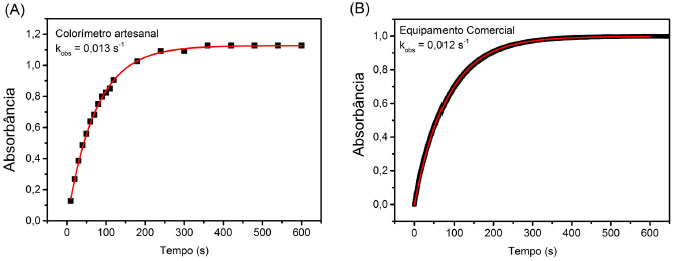 Figura 5. Dados de absorbância vs tempo para a reaçao do AONF com imidazol (0,015 mol L-1) acompanhadas com (A) colorímetro artesanal proposto e (B) espectrofotômetro comercial. Linhas vermelhas correspondem ao ajuste com a equaçao 7