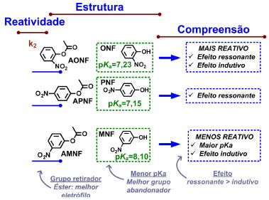 Analisando os dados na Tabela 1 para os diferentes ésteres observa-se que as constantes k2 seguem AONF>APNF>AMNF (kobs segue mesma ordem nas diferentes concentraçoes) evidenciando o efeito do pKa do grupo de saída, onde AONF e APNF foram mais reativos que o AMNF, conforme esperado. De fato, a posiçao do substituinte nitro influencia de forma bastante acentuada a reatividade. No caso do AONF, tem-se um ataque nucleofilico mais suscetível devido ao efeito indutivo exercido sobre a carbonila, fato que é pouco perceptível para o APNF devido à maior distância entre o grupamento nitro e a carbonila. Quando a reatividade dos AONF e APNF é comparada ao acetato de fenila percebemos que os grupamentos nitro diminuem os pKas dos grupos abandonadores (nitrofenóis, vide supra) e que essa diferença afeta majoritariamente a reatividade sendo o acetato de fenila bem menos reativo (k2 = 0,0018 L mol-1 s-1 para reaçao com imidazol ).23 A Figura 7 apresenta um resumo do estudo realizado, onde tem-se uma relaçao da reatividade (k2) com a estrutura do éster e do seu grupo abandonador para levar a compreensao global dos efeitos. Assim, o grupo nitro é retirador de elétrons, o que torna o éster um melhor eletrófilo e diminui o pKa do grupo abandonador. Quanto maior esse pKa, pior o grupo abandonador, portanto o AMNF é o menos reativo. No AMNF tem-se apenas o efeito indutivo do grupo nitro, pois o efeito ressonante na posiçao meta nao afeta significativamente o éster. Já para o APNF, tem-se apenas o efeito retirador ressonante pois a contribuiçao do efeito indutivo é insignificante devido à distância do grupo retirador. Como o efeito ressonante é mais forte que o indutivo, APNF tem maior reatividade que AMNF. Por fim, o AONF se beneficia do efeito retirador ressonante e indutivo do grupo nitro, tornando-o mais reativo.