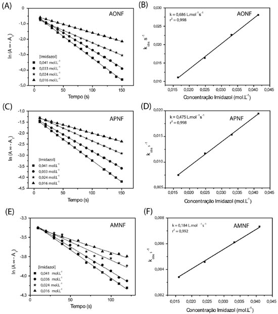 Figura 6. Perfis cinéticos para reaçoes do (A) AONF (C) APNF e (E) AMNF com imidazol em diversas concentraçoes de imidazol e gráficos de kobs vs concentraçao do imidazol para (B) AONF (D) APNF e (F) AMNF