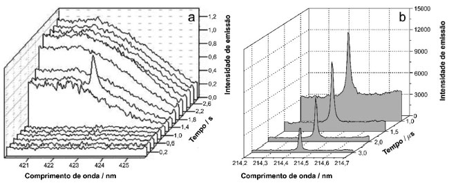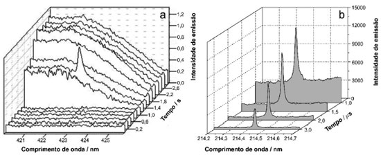 Figura 3. Separaçao temporal do sinal analítico e intenso BG em WCAES (a) e LIBS (b). Medidas referem-se à determinaçao de cálcio (a) e cádmio (b). As intensidades de emissao foram medidas em unidades arbitrárias e as escalas de tempo estao em sentidos opostos para maior clareza. A Figura 3a é reproduzida da referência 26, com permissao da Editora. A Figura 3b refere-se a resultados nao publicados, obtidos em condiçoes similares às descritas na referência 28