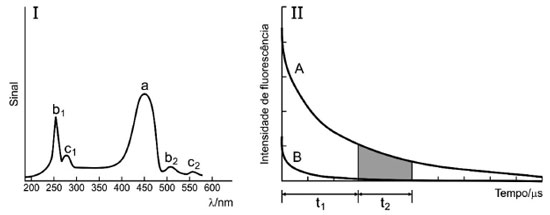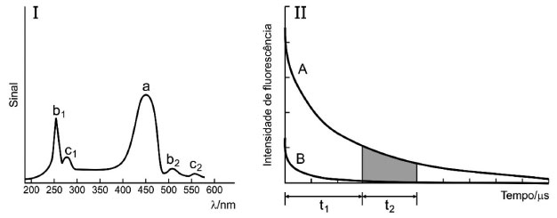 Figura 4. I. Espectro hipotético de fluorescência de uma soluçao aquosa de sulfato de quinino em meio ácido com excitaçao em 254 nm: a-emissao de fluorescência; b1 e b2-sinais de espalhamento elástico - 1ª e 2ª ordem, respectivamente e c1 e c2- bandas de espalhamento Raman da água - 1ª e 2ª ordem, respectivamente. II. Ilustraçao da fluorescência resolvida no tempo para minimizar BG: t1 - tempo de atraso; t2 - tempo de integraçao; A: decaimento da fluorescência do analito ou sonda fluorescente e B: decaimento do BG. Figuras 4I e 4II adaptadas das referências 46 e 47, respectivamente