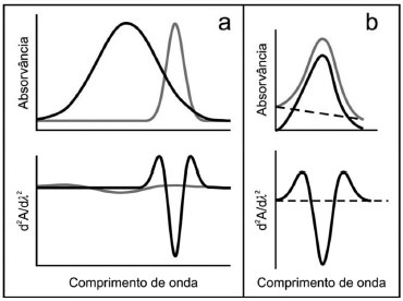 ![]() Figura 5. Representaçao da derivaçao do espectro de absorçao (segunda derivada) para compensar BG e interferências espectrais: (a) eliminaçao da absorçao do BG (espectro em cinza) e (b) do espalhamento de radiaçao; o espectro de absorçao do analito (em preto) é deslocado pelo efeito de espalhamento de radiaçao por partículas sólidas em suspensao, resultando no espectro em cinza. A parte de baixo da Figura ilustra a correçao utilizando a segunda derivada)