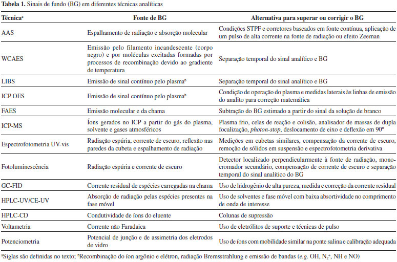 Enquanto os ruídos químicos sao resultado de variaçoes nas propriedades químicas ou físicas da amostra, em consequência de variaçoes de parâmetros experimentais, como temperatura, pressao e umidade, o ruído instrumental é mais complexo. Esse deve-se ao caráter aleatório do movimento dos elétrons nos circuitos elétricos que acompanham movimentos térmicos dos átomos, levando às flutuaçoes de tensao na presença de um elemento resistivo (térmico ou de Johnson), ou dos elétrons cruzando junçoes ou superfícies independentemente da frequência e com comportamento quantizados, também de caráter aleatório (Shot, e.g. ruído da corrente de escuro ou derivado de fótons, elétrons e íons quando atingem o detector de massas, ambos discutidos mais adiante). O ruído Flicker é inversamente proporcional à frequência do sinal e, por isso, também conhecido como 1/f. Geralmente é causado por defeitos nos materiais do instrumento e rugosidades de interface, e.g. ruídos provenientes de flutuaçoes associadas ao processo de introduçao de amostras, o qual pode ser compensado com o uso do método de padronizaçao interna.4 O ruído ambiental é principalmente consequência do chamado "efeito antena", em que diversas radiaçoes eletromagnéticas podem ser captadas e transformadas em sinais elétricos. Nesse caso, o ruído é dependente da frequência. Recomenda-se a consulta a livros texto de análises instrumentais para uma discussao mais detalhada sobre ruídos.5 Este artigo discute didaticamente as fontes de BG em diferentes técnicas instrumentais, assim como estratégias para minimizar e corrigir os sinais espúrios (Tabela 1). Pretende-se demonstrar que o BG é um conceito central em análise instrumental, frequentemente sendo o fator limitante para alcançar resultados confiáveis. Essa discussao é, entretanto, frequentemente negligenciada em livros texto e na discussao de algumas técnicas instrumentais. A discussao é apropriada para estudantes em final de curso de graduaçao ou em disciplinas de pós-graduaçao. Neste sentido, palavras-chave relacionadas a conceitos que deveriam ser previamente entendidos sao sublinhadas no texto. Isso também permite uma revisao dos conceitos essenciais de diversas técnicas instrumentais.