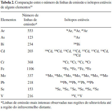 O contrário é observado na espectrometria de emissao óptica com plasma induzido por laser (LIBS), que também se baseia em medidas de emissao, mas a fonte de energia é um curto pulso de laser que vaporiza a amostra e excita os elementos (e fragmentos moleculares) que irao decair emitindo radiaçao.27 Um tempo de atraso é necessário para início da mediçao analítica para evitar a alta emissao contínua (BG) que ocorre no início da formaçao do plasma28 (Figura 3b). Como a diminuiçao da intensidade de emissao do contínuo do plasma ocorre em uma taxa mais elevada do que a dos átomos ou íons excitados no plasma, a separaçao temporal é viável. Assim, um fator fundamental e crítico em LIBS (e também em WCAES) é a capacidade instrumental de realizar a aquisiçao de sinal em diferentes tempos de atraso para encontrar o momento ideal para obtençao dos sinais analíticos. Espectrometria de fluorescência atômica A espectrometria de fluorescência atômica (AFS) baseia-se na absorçao de radiaçao característica por vapores atômicos para produzir átomos excitados, com subsequente detecçao da radiaçao emitida nos processos de relaxaçao, tipicamente a 90º em relaçao à fonte de excitaçao.29 Existem três tipos básicos de fluorescência atômica, classificados de acordo com as transiçoes eletrônicas envolvidas: ressonante, nao ressonante e termicamente assistida.30 O processo ressonante gera a fluorescência de maior intensidade, sendo o mais explorado para fins analíticos, apesar do maior BG (produzido por espalhamento e radiaçao difusa da fonte primária) por conta de se medir o sinal analítico no mesmo comprimento de onda da fotoexcitaçao. A analogia das velas no estádio lotado também é válida em AFS. Os LODs sao apreciáveis especialmente quando AFS é associada à geraçao de vapores de As, Hg, Se e Sb.31 Em alguns casos, LODs comparáveis à técnica de espectrometria de massas com plasma acoplado indutivamente (ICP-MS) sao observados.32 Para isso, etapas de atomizaçao e excitaçao devem ser eficientes, enquanto os processos de supressao (quando a energia do estado excitado é convertida em energia translacional ou transferida para espécies que colidiram com átomo excitado) devem ser minimizados. Diferentes atomizadores e fontes de radiaçao podem ser utilizados em AFS, assim gerando diferentes cenários de BG. Chamas ar/acetileno apresentam alto BG devido à formaçao de radicais (e.g. OH, C2, CH e CN), resultando em elevados LODs. Por outro lado, as chamas baseadas na mistura de argônio e hidrogênio sao recomendadas devido às menores emissoes de BG. Apesar da relativa baixa temperatura, essas chamas sao utilizadas com eficiência, mais especificamente em atomizadores empregados em sistemas comerciais associados à geraçao de hidretos.30 O acoplamento da fluorescência induzida por laser a atomizadores eletrotérmicos combina vantagens como a elevada intensidade da fonte de radiaçao, que favorece a maior populaçao de espécies excitadas, e o confinamento da nuvem atômica no interior do tubo. Nesse caso, o BG é principalmente constituído de emissao de corpo negro e radiaçao difusa da fonte primária.33 Na análise de amostras com matrizes complexas, a fluorescência molecular, fluorescência atômica de concomitantes e espalhamento de radiaçao também contribuem para o BG. Mediçoes baseadas em fluorescência nao ressonante reduzem a contribuiçao do espalhamento e da radiaçao difusa; a detecçao em comprimentos de onda acima de 300 nm reduz a contribuiçao da radiaçao de corpo negro emitida pelo atomizador. Assim como em GFAAS, o corretor de fundo baseado no efeito Zeeman é o único capaz de medir o BG no comprimento de onda analítico, podendo assim corrigir o sinal analítico obtido através da subtraçao da intensidade do BG; é também o único capaz de corrigir BG estruturado. Uma alternativa é dessintonizar o comprimento de onda do laser e medir apenas o BG durante a etapa de atomizaçao. Em seguida, o BG é subtraído do sinal analítico total. Entretanto, essa estratégia, bem como o emprego de detectores multicanais, sao válidas apenas para a correçao de emissao de corpo negro e radiaçao difusa do laser. Empregando um detector multicanal, é possível medir simultaneamente o sinal total e o BG em comprimentos de onda distintos. Essa estratégia instrumental também permite corrigir os efeitos de ruídos originados da fonte de laser.33 Espectrometria de massas com plasma acoplado indutivamente Proposto por Houk et al., em 1980,34 o acoplamento de um ICP a um espectrômetro de massas resultou em uma das mais poderosas técnicas para análise elementar. Ions positivos gerados no plasma à pressao atmosférica sao extraídos através de cones de amostragem e skimmer para uma zona de alto vácuo, na qual as lentes de focalizaçao, o analisador de massas e o detector estao localizados. O número de isótopos estáveis é significativamente menor do que o número de linhas de emissao para um mesmo elemento, resultando em espectros de massas significativamente mais simples do que os espectros de emissao (Tabela 2).35 Essa característica leva à maior detectabilidade (e.g. LODs 40 e 100 vezes mais baixos foram obtidos para determinaçao de Cd e Mo, respectivamente, em comparaçao com ICP OES com configuraçao axial).22 Os fótons emitidos no plasma, que poderiam originar um intenso BG, sao impedidos de atingir o detector, utilizando diferentes arranjos instrumentais. Em instrumentos com geometria linear, o fóton-stop (pequena placa metálica localizada atrás do cone skimmer que bloqueia os fótons e espécies neutras) e o deslocamento do analisador de massas e detector fora do eixo do feixe de íons eram os arranjos mais utilizados.36 Instrumentos com montagem em 90º foram mais recentemente propostos e utilizam um anel vazado, o qual produz um campo eletrostático parabólico que reflete os íons para analisador de massas (posici