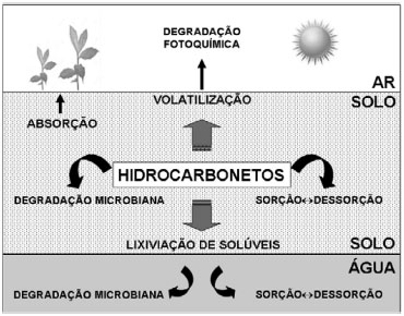 ![]() Figura 1. Representaçao esquemática da dinâmica dos hidrocarbonetos no solo contaminado