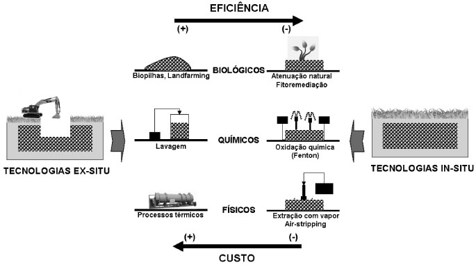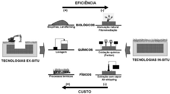 No solo, os hidrocarbonetos alifáticos podem ser parcial ou totalmente degradados, graças à açao de consórcios microbianos formados por bactérias e fungos. Por sua vez, espécies aromáticas mostram maior resistência frente a processos de bioatenuaçao natural, principalmente quando na presença de etanol, em razao da degradaçao preferencial deste aditivo.8 Remediaçao de solos contaminados A remediaçao de solos contaminados por compostos orgânicos é um desafio complexo, principalmente em razao da solubilidade relativamente baixa dos poluentes, da sua retençao por adsorçao nos componentes do solo e do limitado acesso dos micro-organismos para ocorrência de processos de biodegradaçao.5,9 Em decorrência destas características, processos de bioatenuaçao natural apresentam escassa aplicaçao, o que tem servido de incentivo para a proposta de vários procedimentos alternativos, incluindo sistemas de remediaçao in-situ, caracterizados pelo tratamento no próprio local da contaminaçao, e sistemas ex-situ, em que o solo contaminado é previamente removido do local.10 Uma ilustraçao que representa algumas alternativas de tratamento in-situ e ex-situ é apresentada na Figura 2.