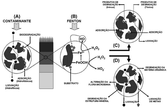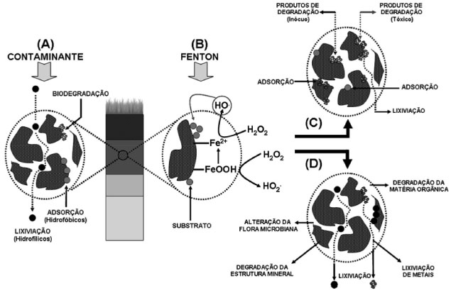 Figura 4. Ilustraçao dos processos que podem ocorrer durante o tratamento de solos contaminados por processos Fenton