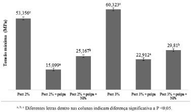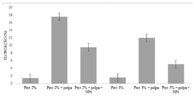 A adiçao de nanoestruturas teve como objetivo melhorar as propriedades físico-químicas. De acordo com a Tabela 1, pode-se observar que com a adiçao de polpa de cacau e com o aumento da concentraçao de pectina houve um acréscimo nos valores das espessuras dos filmes. A adiçao de NPs causou uma diminuiçao na espessura dos filmes devido às interaçoes entre as cadeias poliméricas e as nanoestruturas, o que favorece uma maior compactaçao da matriz. A adiçao de polpa influenciou significativamente para o aumento da espessura causado pelo teor de sólidos presente na polpa. Além disso, com o aumento da concentraçao de pectina ocorre uma diminuiçao da permeabilidade, sendo os menores valores para os filmes contendo apenas o polímero. Com a adiçao da polpa estes valores aumentam. De acordo com Lorevice et al.,21 existe uma diferença entre as quantidades de moléculas entre os filmes e que parte da água fica retida na matriz atuando como um plastificante, sendo atribuído este aumento de permeabilidade à diferença entre a quantidade de moléculas que se difundem no material e aquelas que se desprendem do mesmo. Quando se adicionam as NPs ocorre uma diminuiçao da permeabilidade ao vapor de água dos filmes quando comparados àquele contendo apenas pectina e polpa de cacau. Isto se deve ao fato de que as nanoestruturas preenchem os poros das matrizes. Em 2010, segundo Chang et al.,22 a adiçao de NPs de QS dificulta a passagem de moléculas de água pela matriz do filme por preencher os espaços das cadeias poliméricas. Moura et al.10 constataram diminuiçao nos valores de WVP de filmes de HPMC nanoestrutrados devido às ligaçoes de hidrogênio existentes entre as nanopartículas e o polímero. Dados semelhantes foram encontrados por Lorevice et al.16 em um estudo das propriedades de filmes de polpa de goiaba e NPs de QS sintetizadas por polimerizaçao em molde de ácido metacrílico. Lorevice et al.21 também verificaram que filmes de HPMC e polpa de mamao apresentaram decréscimo nos valores de WVP na presença de NPs de QS. De acordo com os resultados descritos nas Figuras 2 e 3, foi possível observar que com o aumento da concentraçao do polímero e adiçao de NPs de QS, houve um acréscimo nos valores de tensao (σ) e um decréscimo na % de elongaçao dos filmes. As NPs interagem com a matriz diminuindo o escoamento entre as cadeias, dificultando o rompimento do filme. De acordo com Martelli et al.,15 os açúcares presentes na polpa atuam como plastificante, entretanto, com a adiçao de NPs esse efeito plastificante diminui. Os plastificantes reduzem as forças intermoleculares entre as cadeias poliméricas, melhorando a flexibilidade, força e resistência dos filmes.23 Uma diminuiçao na elongaçao também foi observada por Gómez-Estaca et al.24 em filmes de gelatina de peixe e quitosana. As nanoestruturas diminuem o volume livre entre as cadeias do polímero, aumentando as forças intermoleculares ma matriz.11