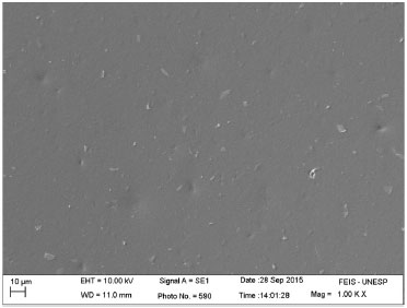 De acordo com Moura et al.,10 a incorporaçao de nanoestruturas nos filmes pode aumentar a resistência mecânica devido à substituiçao parcial do polímero por nanoestruturas na matriz do nanocompósito. Outro motivo pode ser a ocupaçao de parte dos espaços vazios entre as cadeias do polímero pelas nanoestruturas, o que causa um aumento na resistência decorrente de uma maior compactaçao da matriz. Ainda na Figura 3 podemos observar que ocorre uma melhoria na elongaçao dos filmes com polpa de fruta. Mesmo com a adiçao de nanopartículas esses filmes ainda permanecem com uma elongaçao maior que os filmes contendo apenas pectina. Essa característica é interessante uma vez que as utilizaçoes de filmes com maior tenacidade na área de embalagens sao muito requisitadas. Apesar de essa tenacidade diminuir com a adiçao de nanopartículas, ela ainda está melhor que a dos filmes contendo somente pectina. Esse resultado é bastante inovador nessa área, uma vez que nao sao encontrados ainda na literatura relatos do comportamento de filmes de polpa de cacau melhorados com nanopartículas de quitosana que apresentem tenacidade satisfatória. Nas Figuras 4 e 5 é possível observar através das análises de MEV os efeitos da adiçao de polpa de cacau na microestrutura dos filmes. O filme contendo polpa apresenta-se mais heterogêneo devido à presença dos açúcares na polpa. Em um trabalho com filmes de pectina e polpa de açaí, resultados semelhantes foram relatados. Os filmes contendo somente pectina apresentaram uma superfície mais homogênea quando comparados aos filmes que continham açaí.14