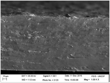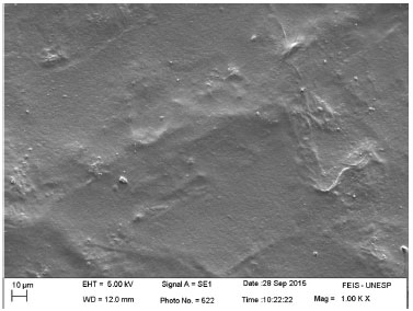![]() Figura 4. Micrografia obtida por MEV da superfície do filme de pectina. A micrografia possui magnitude de 1000 X