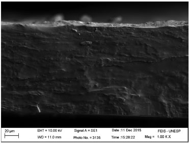![]() Figura 6. Micrografia de fratura obtida por MEV do filme de pectina e polpa de cacau. A micrografia possui magnitude de 1000 X