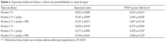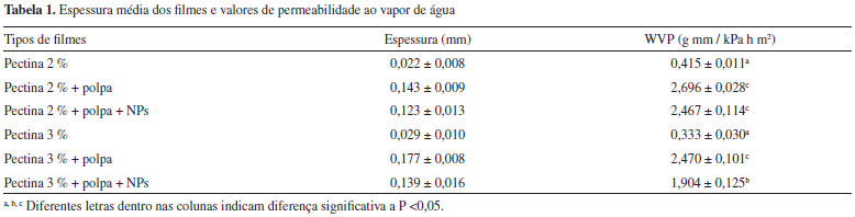 A espessura média dos filmes foi maior para aqueles contendo maior concentraçao do polímero e para os que continham polpa de cacau, conforme a Tabela 1. A espessura pode ser influenciada pela quantidade e tipo de componentes da matriz polimérica, técnica de preparo, tipo de solvente utilizado, dentre outros fatores.