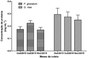 ![]() Figura 1. Quantificaçao de inibidores de proteases do extrato enriquecido de sementes de Punica granatum e de Glycine max. Os extratos enriquecidos de sementes de P. granatum e a base de G. max grao, obtidos de extraçoes em diferentes datas foram detectadas pelo método de Bradford (1976) a uma absorbância de 595 nm. Barras=média±desv.padrao