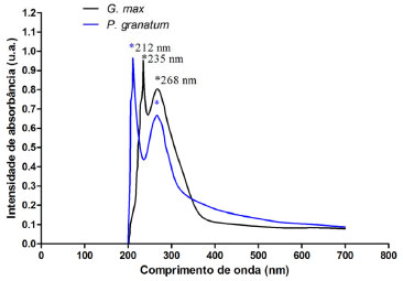![]() Figura 2. Espectro de absorçao molecular de inibidores de proteases dos extratos enriquecidos a base de sementes de Punica granatum ( - ) e graos de Glycine max ( - ). As amostras apresentaram curvas analíticas de absorçao em 212 nm para P. granatum, 235 nm para G. max e 268 nm para ambos os extratos, sendo monitorados de 199 a 700 nm. A varredura foi realizada com as amostras diluídas em água destilada e a temperatura ambiente