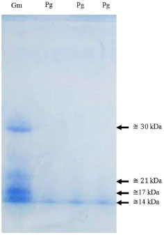 ![]() Figura 3. Perfil eletroforético (12% SDS-PAGE) do extrato enriquecido a base de sementes de Punica granatum. Legenda: Gm: extrato a base de Glycine max grao (padrao de inibidores de proteases). Pg: extrato a base de sementes de P. granatum. Foi aplicado em cada poço, 20 µl de amostra. Gel corado com Coomassie Blue R-250. Seta=peso molecular aproximado das bandas (kDa)