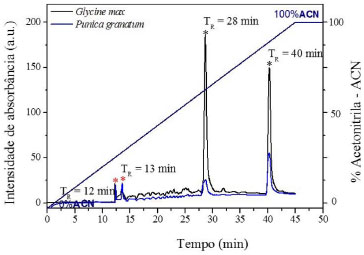 ![]() Figura 4. Perfil cromatográfico em HPLC obtido da leitura da amostra do extrato enriquecido a base de sementes de Punica granatum e Glycine max grao. Condiçoes cromatográficas: Coluna utilizada LC18 (25 cm x 4,6 mm) Supelcosil, 2,2 mL. Fase Móvel: A: H2O + TFA 0,1%; B: ACN + TFA 0,08%. Eluiçao por gradiente: 0 a 100% B em 45 min; fluxo: 0,8 mL min-1. *Picos de absorçao de inibidores de proteases de interesse
