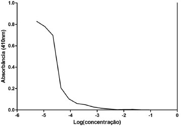 ![]() Figura 5. Atividade anti-tripsina do extrato enriquecido a base de sementes de Punica granatum. 20 µL de diluiçoes seriadas do inibidor foram adicionadas a cada tubo de ensaio que continha 200 µL de DL-BApNA (N-α-benzoil-DL-arginil-p-nitroanilida) e 20 µL de tripsina (0,05 mg mL-1). A quantificaçao da atividade inibitória foi analisada em 410 nm. A EC50 foi calculada através da análise da regressao nao-linear da curva