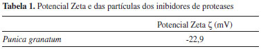 Os dois primeiros picos de retençao (12 e 13 minutos) possivelmente representam na G. max os inibidores de proteases da família Bowman-Birk (BBI),13,20 e sao os mesmos referentes ao dímero do inibidor de proteases detectados no gel de poliacrilamida em 14 kDa. O fato de aparecerem dois picos no cromatograma referentes a apenas uma banda de inibidor de proteases no gel, pode estar relacionado com a nao divisao do dímero em duas isoformas, comportamento recorrente para inibidores de proteases.18 O cromatograma apresentou, ainda, outros dois picos em tempos de retençao de 28 e 40 minutos, que supostamente representam alguma proteína que nao foi detectada no extrato de P. granatum pelo gel de poliacrilamida, devido a sua baixa sensibilidade comparada ao sistema de HPLC para detecçao de partículas, ou possível falha no processo de coloraçao do gel. Já para o extrato de G. max os picos nos tempos de retençao de 28 e 40 minutos tiveram uma maior intensidade e simetria, podendo ser a representaçao das outras bandas aparentes no gel, uma vez que a G. max possui ampla distribuiçao de inibidores de proteases do tipo Kunitz e das lectinas em suas sementes, que apresentam massas moleculares em torno de 21-22 e 30-35 kDa, respectivamente.19 Sendo assim, tendo o perfil cromatográfico do extrato de graos de G. max como padrao de comparaçao, pode-se supor que os tempos de retençao de 12 e 13 minutos sao referentes à presença de inibidores de proteases do tipo BBI. Os demais picos em 20 e 48 minutos, assim como descrito para as leguminosas, nos extratos de P. granatum e G. max, possivelmente sao relativos aos inibidores de proteases do tipo Kunitz e lectina. No que se refere à afinidade com a coluna, os dois primeiros picos de ambos os extratos enriquecidos tiveram uma hidrofobicidade de 40 e 43,3%, referentes aos tempos de retençao de 12 e 13 minutos respectivamente, o que pode confirmar que essas proteínas detectadas sao relativamente hidrofílicas e detentoras de baixo peso molecular, característica de inibidores de proteases do tipo BBI.9 Distribuiçao do potencial Zeta dos inibidores de proteases Conforme demonstrado na Tabela 1, a amostra do extrato de Punica granatum obteve um valor negativo como o esperado para proteínas.