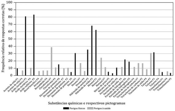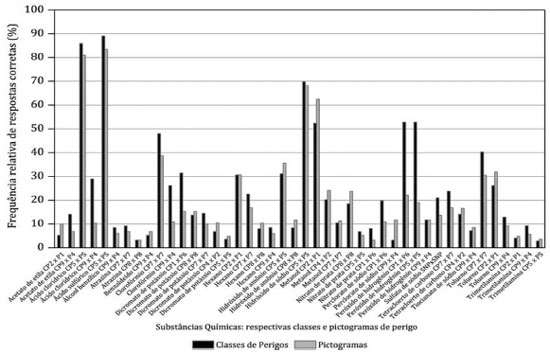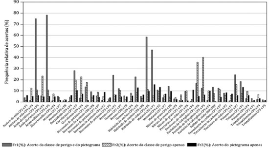 Em geral, a frequência relativa de acertos pelos estudantes foi maior para as classes de perigo do que para os pictogramas (Figura 1).
