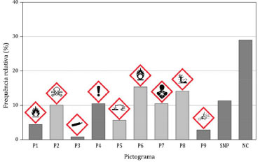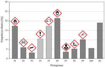 Os pictogramas P4 e P7 (Tabela 2), que representam perigos à saúde sao símbolos introduzidos pelo GHS, e sao menos familiares aos estudantes quando comparados aos pictogramas que representam produtos inflamáveis, corrosivos ou oxidantes, cujos símbolos sao semelhantes aos utilizados em outros sistemas de classificaçao de perigos como, por exemplo, o de transporte de produtos perigosos. Além disso, um mesmo pictograma do GHS abrange diferentes tipos de danos à saúde, o que pode contribuir para a dificuldade de interpretaçao desses pictogramas. Boelhouwer et al.,23 em estudo que avaliou a importância da inclusao dos pictogramas do GHS nos rótulos e fichas de segurança para a compreensao dos perigos de produtos químicos, sugerem que o baixo índice de reconhecimento do pictograma que representa os perigos crônicos à saúde do GHS (P7, Tabela 2) pode estar relacionado à polissemia do símbolo empregado para identificar diversos danos: sensibilizante respiratório, mutagênico, carcinogênico, tóxico ao sistema reprodutivo, tóxico à órgaos específicos e perigosos por aspiraçao.23 O anexo 6 do GHS fornece orientaçoes para a aplicaçao de testes de compreensibilidade dos elementos de comunicaçao de perigos que utiliza, dentre eles os pictogramas de perigo.25 Esses testes sao particularmente importantes para os pictogramas que foram introduzidos por esse sistema. Observou-se também que os estudantes confundiram os pictogramas que representam os perigos de produtos inflamáveis (P1, Tabela 2) e oxidantes (P6, Tabela 2). O gráfico da Figura 3 mostra os pictogramas que os estudantes associaram ao peróxido de hidrogênio, destacando os pictogramas que realmente indicam os perigos desta substância.