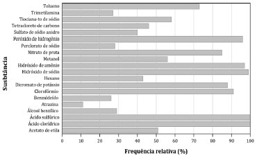 ![]() Figura 4. Frequência relativa de indicaçao pelos estudantes das substâncias como já manipuladas no curso