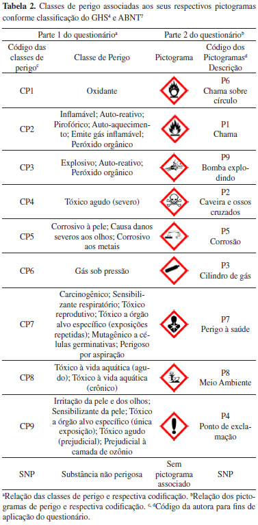 Os estudantes receberam a 'Parte 1' do questionário, que apresentava uma lista de 20 substâncias químicas (Tabela 1), cada uma das quais os estudantes deveriam marcar como previamente manipuladas ou nao por eles nas aulas da graduaçao. Havia ainda uma tabela a ser preenchida, relacionando cada substância com a(s) respectiva(s) classe(s) de perigo descrita(s) e codificada(s) na Tabela 2. Finalizada esta etapa, os estudantes foram orientados a guardar a 'Parte 1' dentro de um envelope e só entao receberam a 'Parte 2' que continha outra tabela para que associassem cada substância ao(s) respectivo(s) pictograma(s), conforme codificaçao apresentada na Tabela 2. Ambas as associaçoes deveriam ser realizadas considerando as substâncias na forma como sao encontradas no seu frasco original, antes de serem diluídas, dissolvidas ou misturadas.
