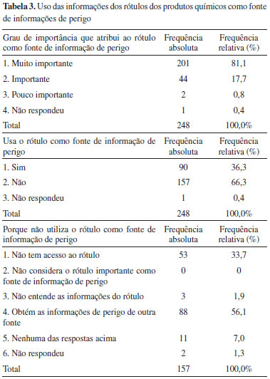 RESULTADOS E DISCUSSAO A maioria dos estudantes tinha, na ocasiao da pesquisa, entre 18 e 23 anos (74%) e cursava o 2º semestre do curso de Química (36%). A proporçao de estudantes que respondeu já ter trabalhado com produtos químicos fora da graduaçao foi de 49,2% e a que respondeu que nao, 50,8%. A Tabela 3 mostra que, embora a maioria dos estudantes considere o rótulo dos produtos químicos uma importante fonte de informaçao de perigos (81,1%), a maior parte também respondeu que nao utiliza o rótulo para este fim (66,3%), principalmente porque usa outra fonte de informaçao (56,1%) ou porque nao tem acesso ao rótulo dos produtos químicos (33,7%).