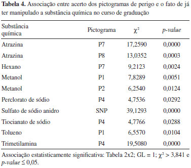 A manipulaçao da substância química em aulas prévias no curso nao favoreceu o reconhecimento dos pictogramas de perigo da maior parte das substâncias químicas presentes no questionário. A Tabela 4 mostra os resultados do teste χ2 para as situaçoes (dentre as 43 ao todo) que apresentaram associaçao estatisticamente significativa entre a frequência relativa de respostas corretas dadas pelos estudantes aos pictogramas e o fato de já terem manipulado a substância em aulas anteriores no curso de graduaçao.
