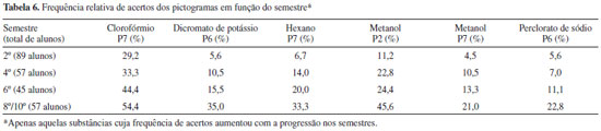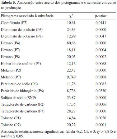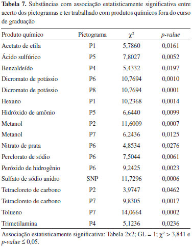 Esperava-se, inicialmente, que a frequência de acertos pelos estudantes dos últimos semestres fosse maior do que pelos estudantes dos primeiros, uma vez que a carga horária de práticas em laboratórios e o contato com produtos químicos se acumulam ao longo dos anos. Entretanto, nao foi o que se observou para a maioria das substâncias apresentadas. O fato de o estudante ter trabalhado com produtos químicos fora da graduaçao contribuiu mais que o tempo de curso para a frequência de acertos dos pictogramas pelos estudantes, embora essa contribuiçao ainda tenha sido observada para a minoria das situaçoes apresentadas. A Tabela 7 mostra que 17 das 43 situaçoes analisadas evidenciaram associaçao estatisticamente significativa entre a frequência de acertos dos pictogramas e o fato do estudante já ter trabalhado com produtos químicos fora do curso.