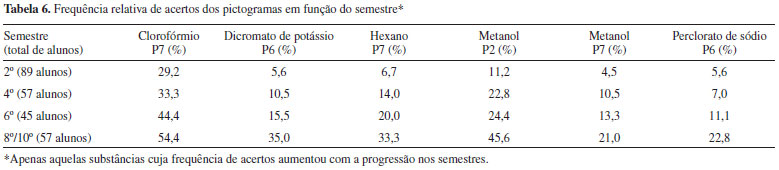 O problema em questao nao é o fracionamento, que é coerente com a manipulaçao de pequenas quantidades do produto, mas sim a falta de informaçoes de segurança nos rótulos dispostos nos frascos de fracionamento. Uma vez que os estudantes terao contato somente com esses rótulos, nao terao os mesmos como fonte de informaçao de perigos. Essa observaçao corrobora as respostas dos estudantes ao indicarem como uma das razoes de nao utilizarem os rótulos como fonte de informaçoes de perigo, o fato de nao terem acesso aos mesmos (Tabela 3). Razoes semelhantes às discutidas anteriormente podem explicar também o resultado de nao ter-se verificado associaçao estatisticamente significativa entre a frequência de acertos dos pictogramas pelos estudantes e o tempo de curso (semestre da graduaçao) para a maioria das substâncias do questionário. Somente 16 das 43 situaçoes analisadas mostraram associaçao estatisticamente significativa entre a frequência de acertos dos pictogramas e o semestre em curso (Tabela 5) e destas apenas 6 mostraram o aumento da frequência de acertos com o aumento do tempo de curso na graduaçao (Tabela 6).
