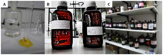 Figura 7. Frascos secundários disponibilizados nas aulas (A)e (B); e armazenamento dos frascos originais (C)