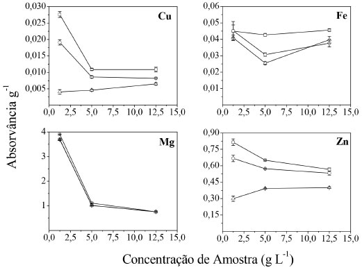 ![]() Figura 1. Efeito da concentraçao de amostra no sinal de absorvância dos analitos Cu, Fe, Mg e Zn em soluçoes de diferentes granulometrias: (□) <25 µm; (○) entre 25 a 53 µm e (△) entre 53 a 150 µm