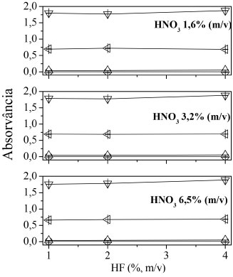 Verificou-se que nao houve diferenças significativas no sinal de absorvância na medida em que a composiçao ácida foi variada para a determinaçao de Cu, Fe, Mg e Zn. Dessa forma, para o preparo das amostras, foi adotada a menor concentraçao dos ácidos: 1,6 % m/v HNO3 e 1,0 % m/v HF. É importante ressaltar que sem o uso do HF nao há uma completa decomposiçao, dado que as amostras de cerâmicas sao ricas em silício, o que resultaria em um procedimento de extraçao. Paralelamente, foi preparado um experimento no qual uma replicata da amostra foi deixada durante a noite à temperatura ambiente e na presença dos ácidos. Após pelo menos 12 h nao foi observada nenhuma alteraçao, tendo em vista que permaneceu uma quantidade de sólido no fundo do frasco, comprovando, assim, a açao do ultrassom para a completa decomposiçao das amostras de cerâmicas. Avaliaçao da concentraçao de CsCl/LaCl3 para a determinaçao de Mg A ionizaçao e a formaçao de compostos refratários sao interferências do tipo nao espectral e que podem ser consideradas comuns em análises por F AAS. Na interferência de ionizaçao, os metais alcalinos e alcalinos terrosos, como o Na, K, Ca e Mg, sao considerados os elementos mais suscetíveis a interferências desta natureza, devido a seus baixos potenciais de ionizaçao em relaçao aos demais elementos. Para a minimizaçao dessa interferência, é possível adicionar junto às amostras e às soluçoes de calibraçao outro elemento mais facilmente ionizável (como, por exemplo, o Cs). Para as interferências de formaçao de compostos refratários, é comum a utilizaçao de outro elemento capaz de formar, com o interferente, um composto mais estável. O elemento mais utilizado para esses casos é o La, conhecido como "agente liberador" justamente pelo fato de competir pelos compostos interferentes, liberando o analito de interesse para ser atomizado.11 Para a determinaçao de Mg em cerâmica foi avaliada a concentraçao a ser usada de CsCl e LaCl3 (soluçao de Schinkel) em soluçoes ácidas após a decomposiçao assistida por ultrassom, com diferentes concentraçoes de HF. Os resultados obtidos deste estudo estao apresentados na Figura 3.
